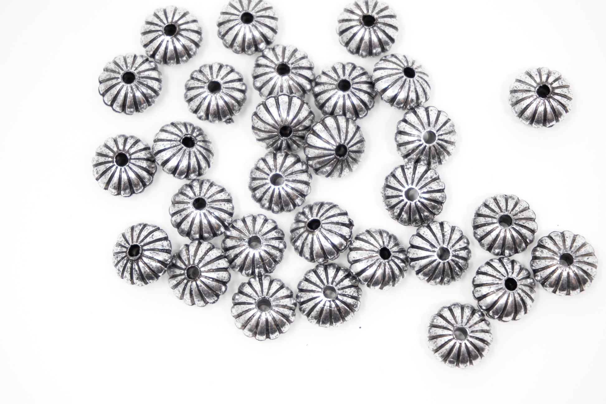 Give your next craft project a vintage feel with these Tibetan spacer beads. Vintage look alike beads sold in a Antique Silver color. Made from plastic they are lightweight but will definitely stand out among other charms and beads. They have a saucer shape so you can easily attach them on any string. Each bead features a flower pattern and they are ideal as spacer beads, jewelry findings, or beaded on their own.