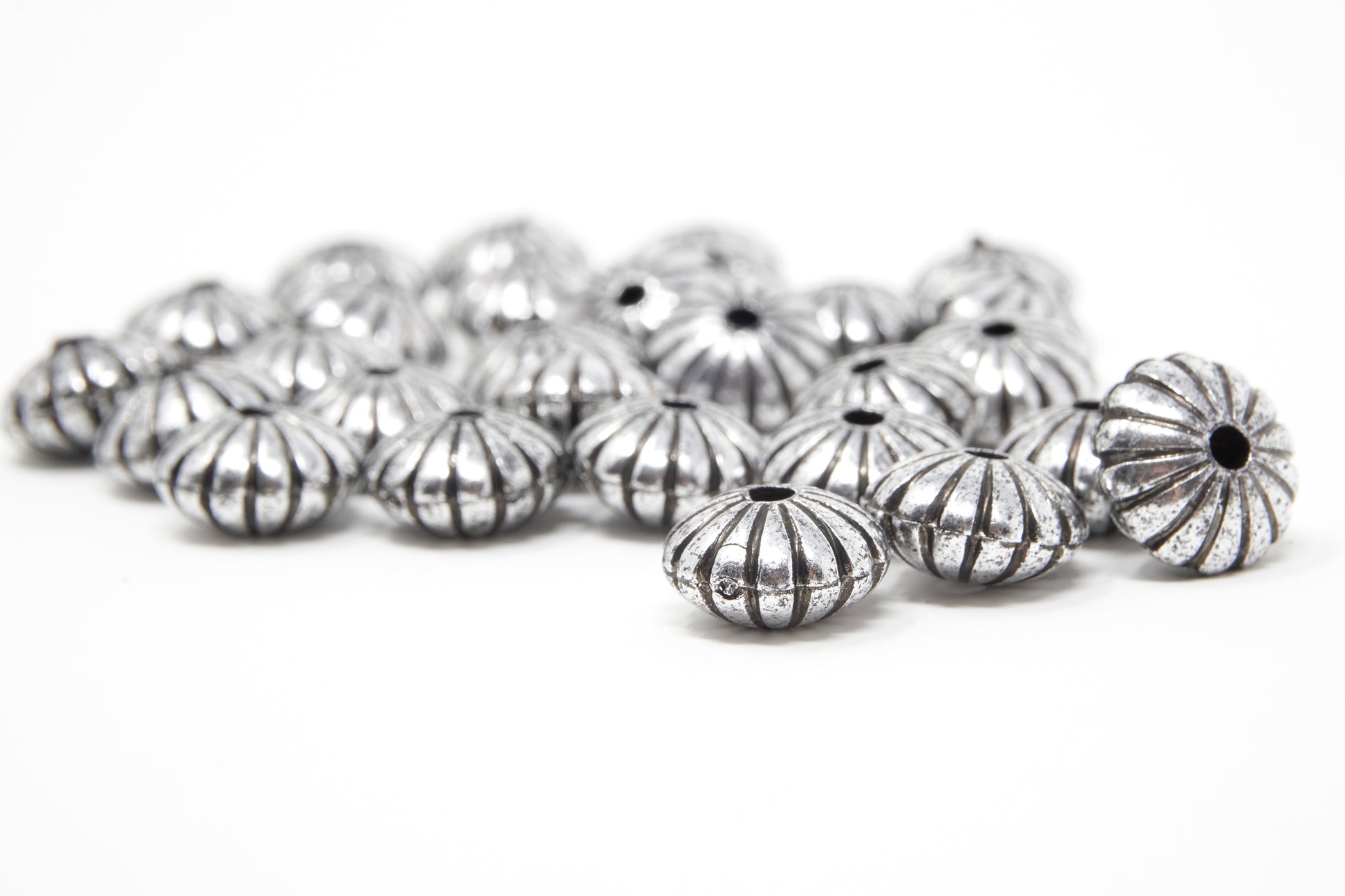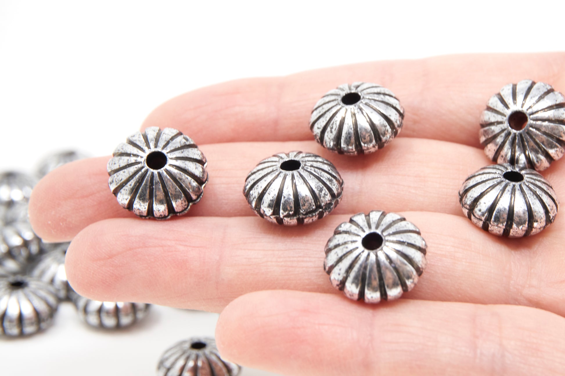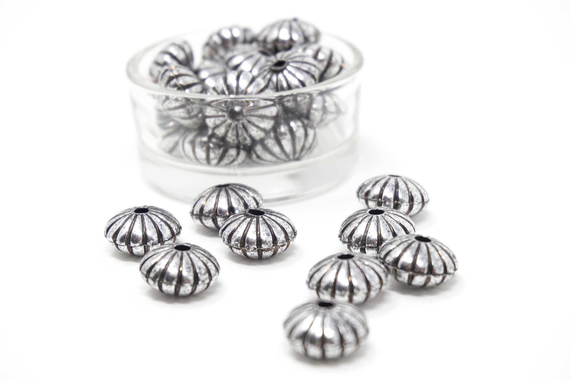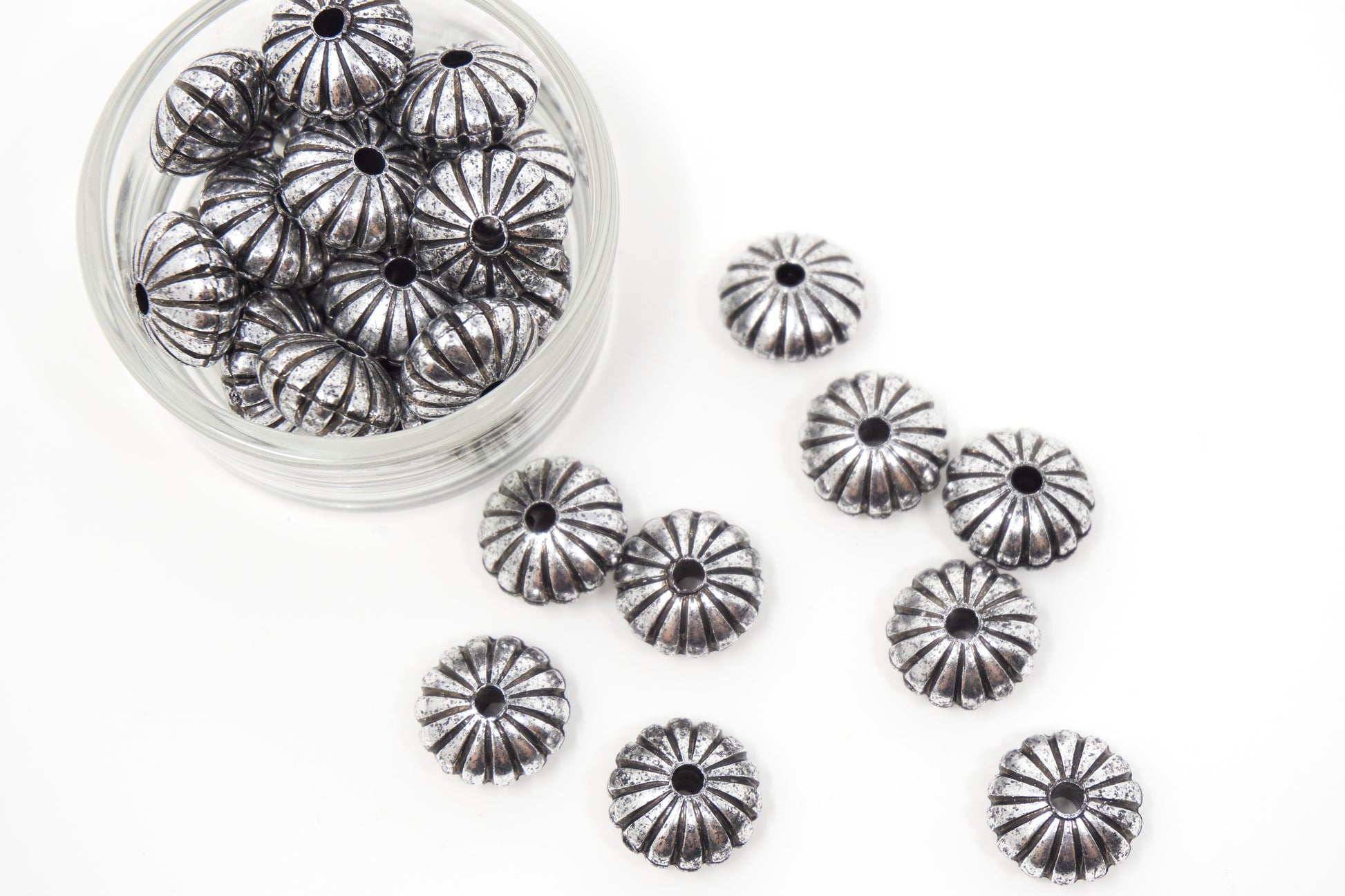 30 pieces of Antique Silver hollow saucer acrylic beads are perfect for DIY jewelry making and other craft project. Beads measure about 14mm in diameter, 8mm wide, hole: 3mm and are drilled vertically.