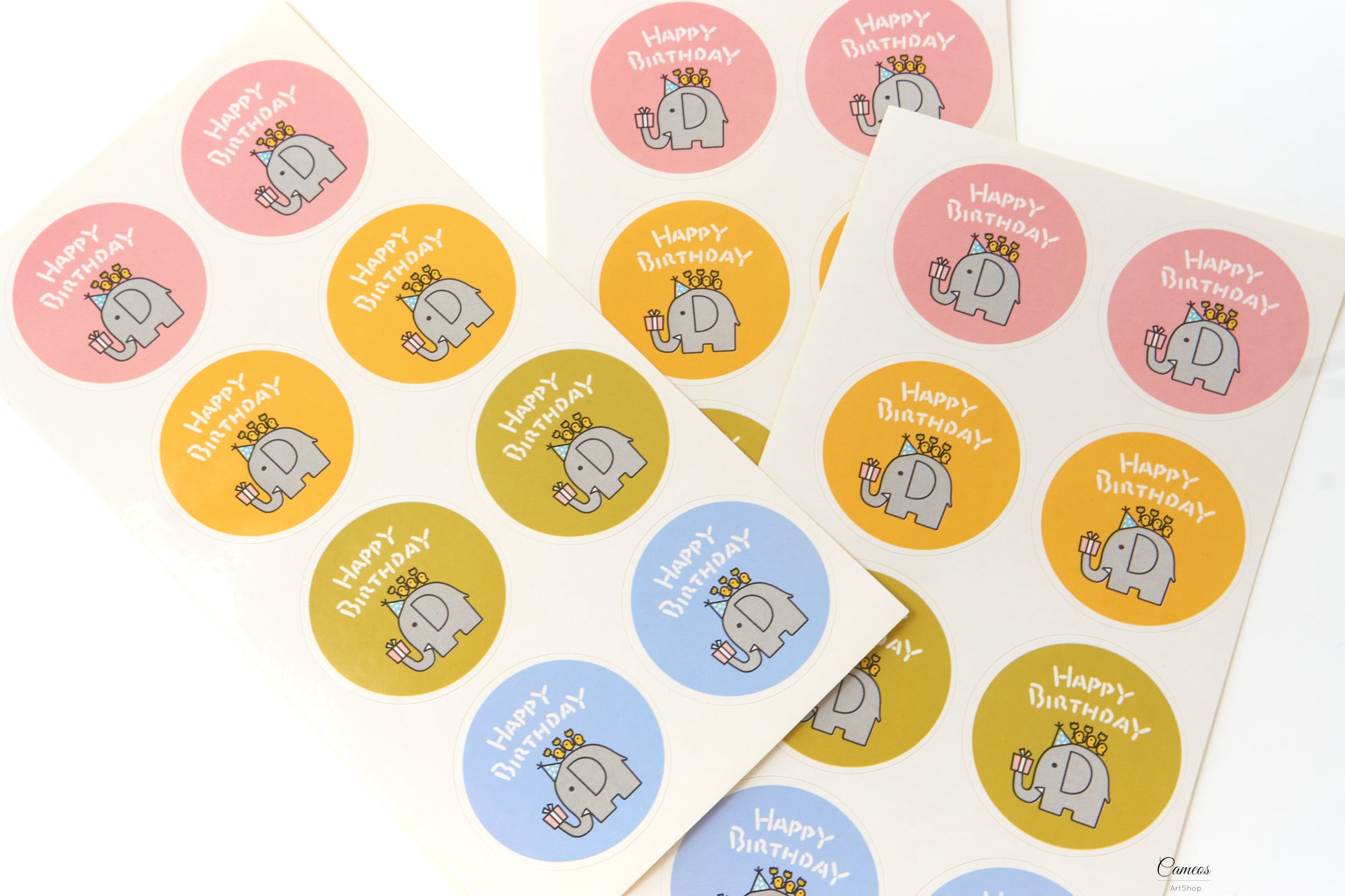 Super cute elephant happy birthday stickers. These can be used for decorating a present or decorating gift boxes, treat bags and crafts with them, or pass them out during the party so your guests can decorate themselves.
