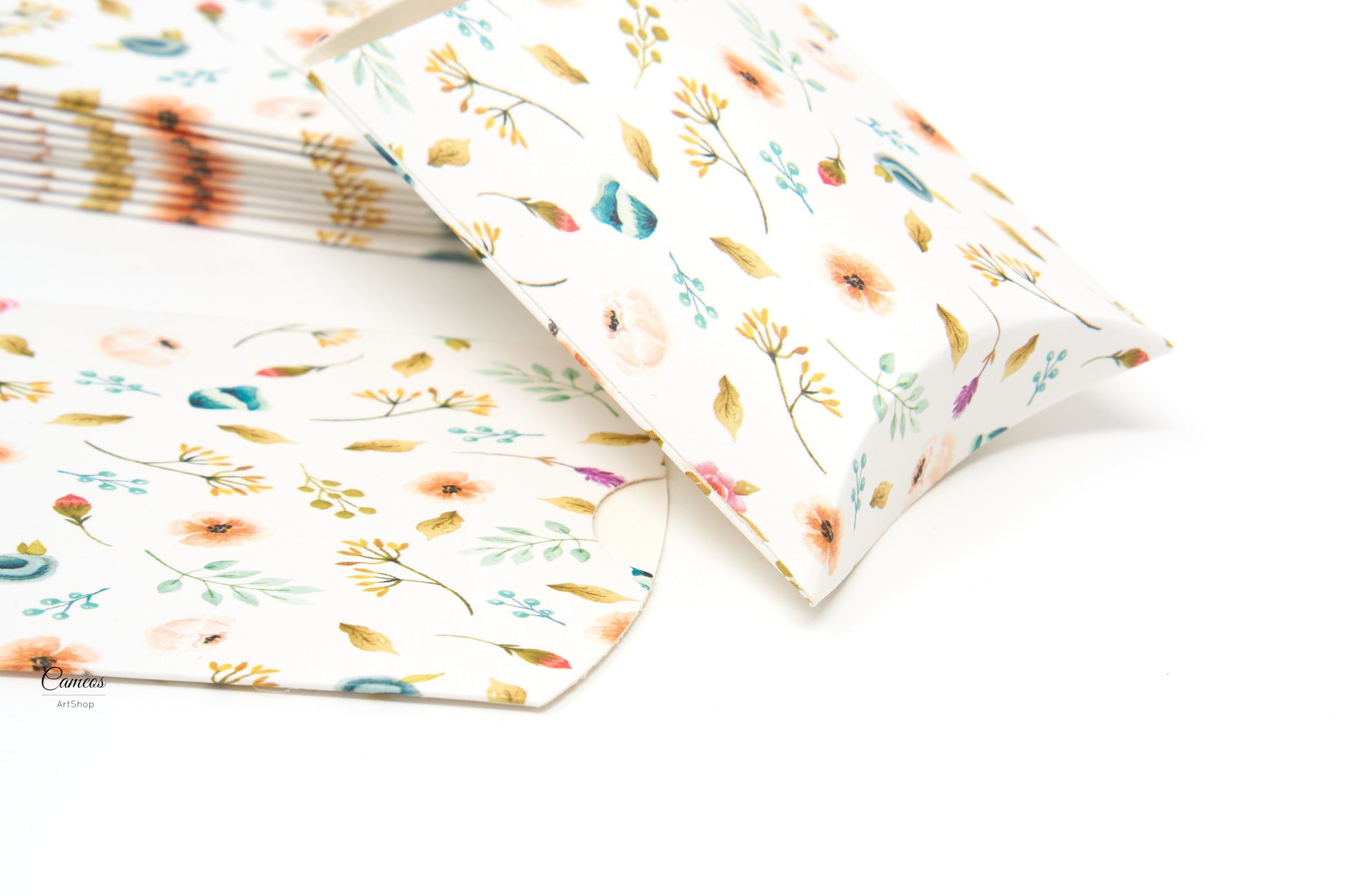 You will get 5 pcs paper pillow gift boxes with flower pattern to fold yourself. Packaging boxes, party candy boxes.