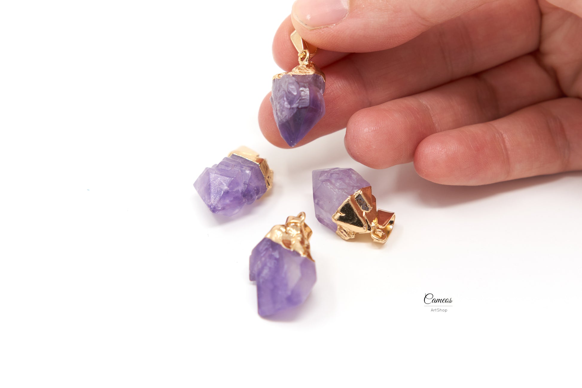You will get 1 pcs beautiful natural amethyst gemstone with iron findings. These beautiful pendants include a golden color brass finding for easy jewelry making (necklace or charm). These are natural amethyst pendants so each stone will vary slightly in the shape and color.