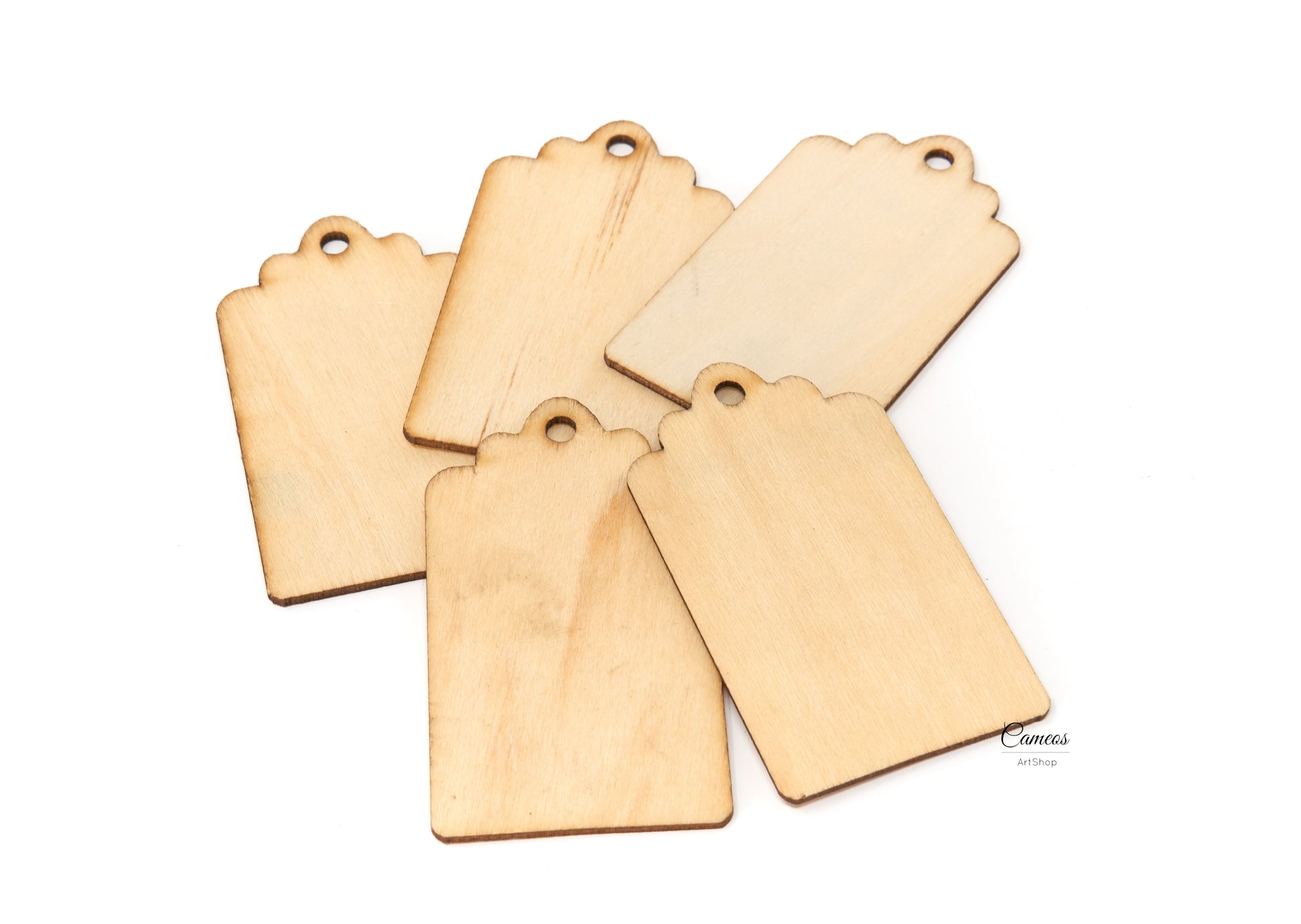 You will get 5 pieces of undyed wood big pendants, tags about 39mm wide, 68mm long, 2mm thick, hole: 4mm. Each tag has hole: 4mm