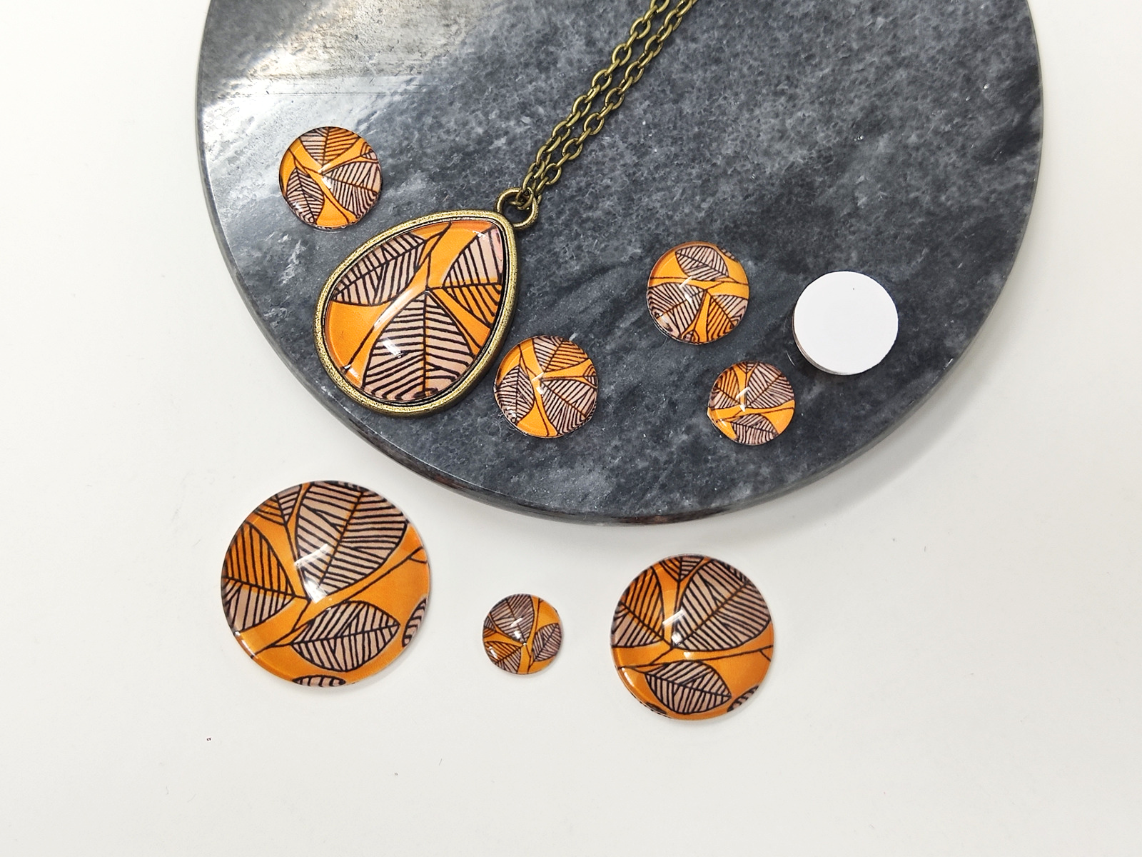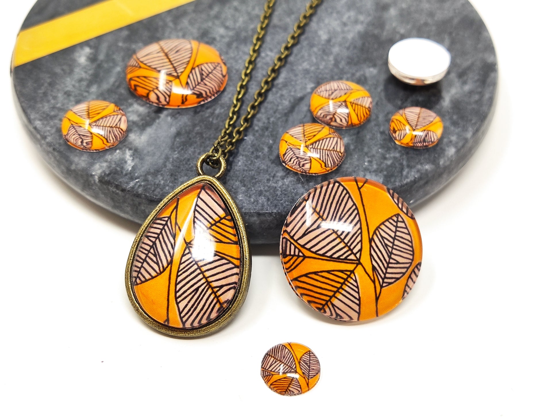 Create amazing jewelry and crafts with these floral cabochons. Entirely handmade from autumn -inspired photo paper and glass, the back is flat and the front is a small dome. The cabochons have a round shape and they are available in a selection of sizes. These cabochons are elegant, feminine with a yellow and black leaf, botanical design.